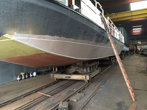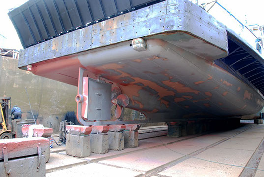 Na aankomst op de werf wordt het vaartuig dan wel in het dok op blokken geplaatst of op de helling gezet.