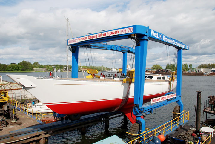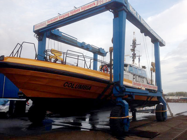 De travellift speciaal voor het horizontaal ophijsen van het vaartuig.