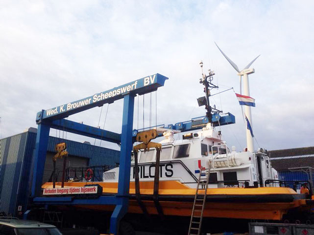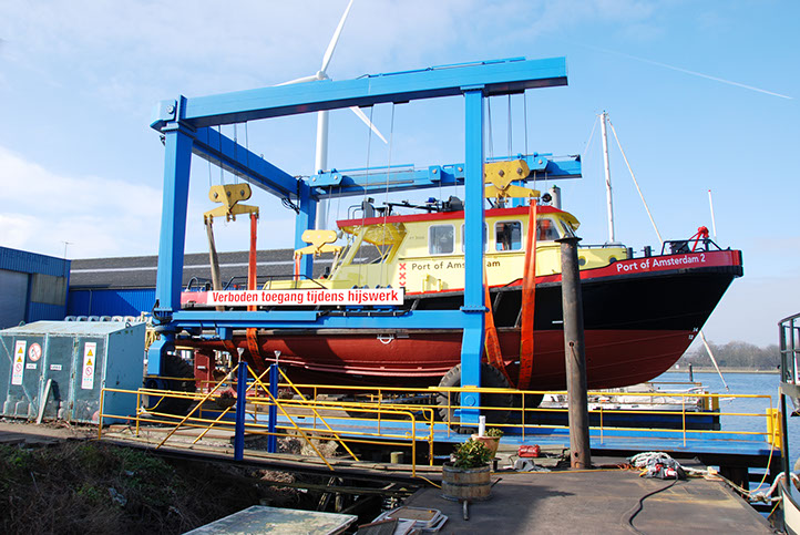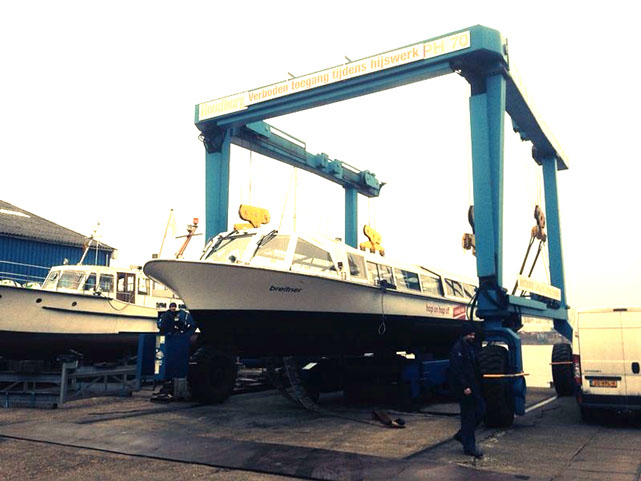De travellift hijst maximaal 70 ton en vaartuigen met afmeting van 30 mtr lengte en 6.60 mtr breedte.